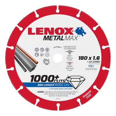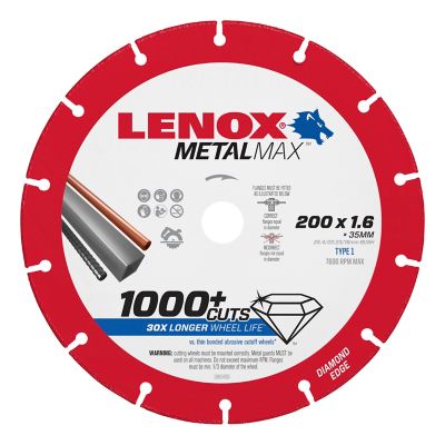 1,000+ cuts: MetalMax delivers 1,000 or more cuts with no need for wheel changes. That is 30 times longer life than thin bonded cut-off wheels.* Long Life: Advanced diamond technology provides extreme durability in metal cutting applications, leading to increased productivity, reduced downtime, and a lower cost per cut compared to thin bonded cut-off wheels. Diameter retention:because LENOX MetalMax is made with diamonds, it doesn't get smaller. The cutting depth stays the same throughout its life, meaning better control, reach and precision. Less dust residue: with LENOX MetalMax there is less odor and dust residue as the wheel does not wear down like bonded abrasives. Sparks originate only from the material being cut. One wheel, multiple materials:One wheel, multiple materials: MetalMax is recommended for multiple types of metal including steel, sheet metal, stainless steel, rebar, cast iron, aluminum**and non-ferrous metals. LENOX MetalMax is designed for use in the same power tools as bonded abrasive wheels, at the same RPMs and feed forces. No changes in operating settings are required. Use LENOX MetalMax as you would a bonded abrasive wheel. *Average performance for 4.5" inch wheel in 1" carbon steel square tube vs thin bonded abrasive cut-off wheels. **When cutting aluminum, it is recommended to apply cutting wax or other type of saw lubricant to avoid chip welding.